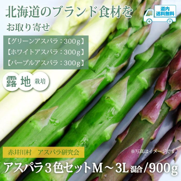【AA-204R】2026年 赤井川村アスパラ研究会 露地栽培アスパラ3色セットM~3L混合 グリーンアスパラ 300g & ホワイトアスパラ 300g & パープルアスパラ 300g 【冷蔵】赤井川村アスパラ研究会 ★te・to・teに掲載★【5月10日~6月10日に順次発送】道内送料無料