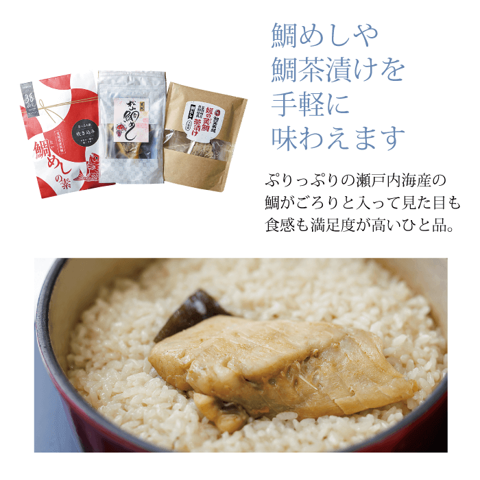 ほかにも愛媛県産の真鯛を使った「鯛めしの素」と、県南部に位置する愛南町の真鯛を使った「媛の炙鯛茶漬け」がセット。