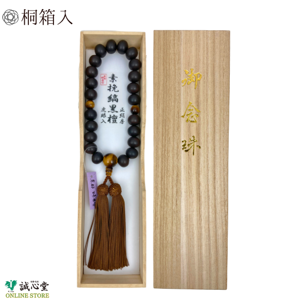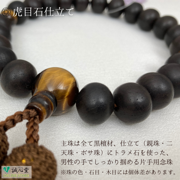 ■男性用 念珠 数珠 素挽 黒檀 虎目 トラメ 仕立 片手 22玉 主玉12mm 木玉 石 黒 正絹房 タイガーアイ 茶 緑 京都 珠香堂 日本製 誠心堂【道内送料無料】