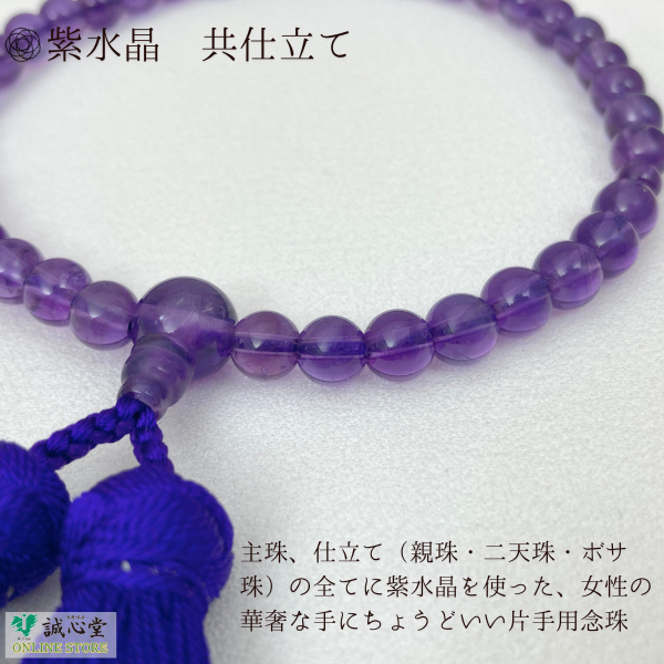 女性用 念珠 数珠 片手 紫水晶 アメジスト 古都房 水晶37玉 主玉7mm 石 共仕立 紫 濃い紫 正絹房 京都 珠香堂 日本製 誠心堂【道内送料無料】