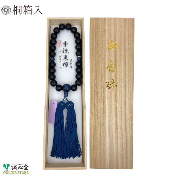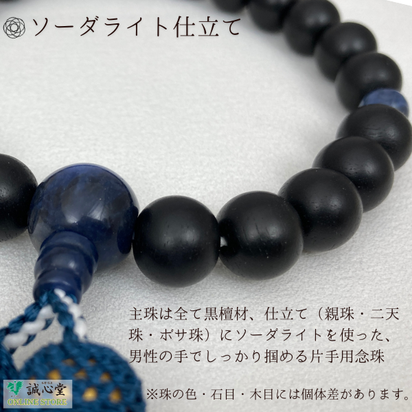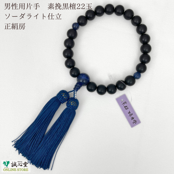 男性用 念珠 数珠 素挽 黒檀 ソーダライト 仕立 片手 22玉 主玉12mm 木玉 石 青 正絹房 黒 ブルー 京都 珠香堂 日本製 方曹達石 誠心堂【道内送料無料】