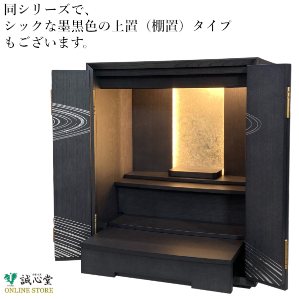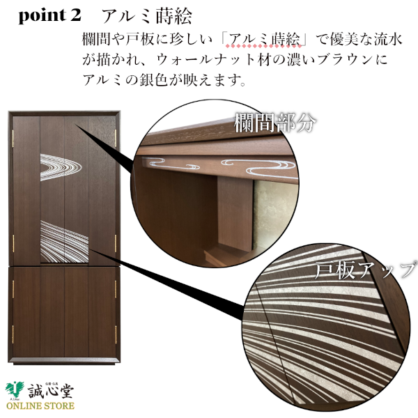 左右非対称なアルミ蒔絵の流水が見栄えするシックなお仏壇です。