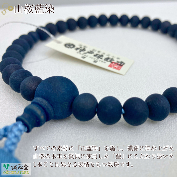 女性用 念珠 数珠 藍珠 aidama 藍染 山桜 36玉 主玉8mm 木玉 共仕立 藍 青 濃紺 神戸珠数店オリジナル 日本製 誠心堂【道内送料無料】