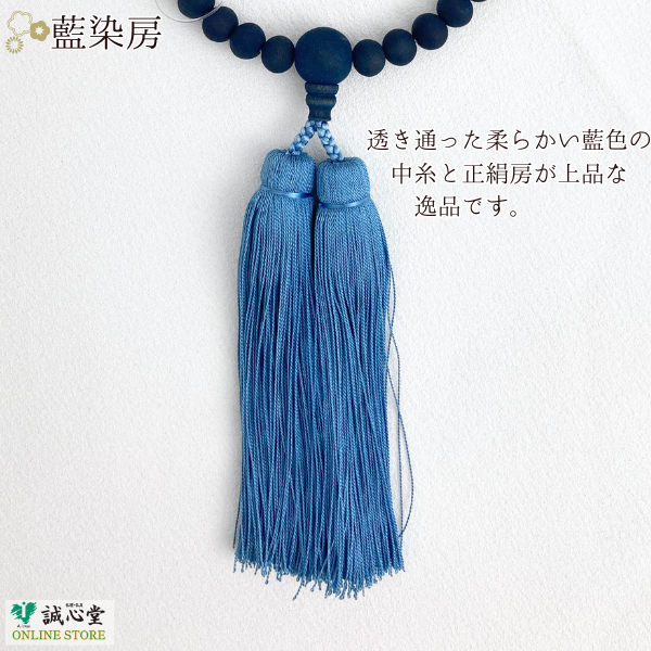 中糸と房は正絹を用い、こちらも藍染で優しい青に染め上げられています。