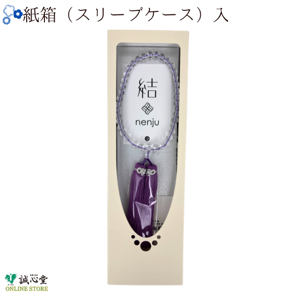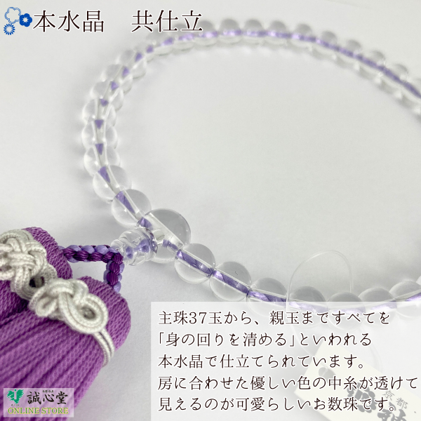 女性用 念珠 数珠 結 musubi シオン 水晶 37玉 主玉8mm 本水晶 共仕立 叶房 神戸珠数店オリジナル パステル 紫 藤色 パープル 日本製 誠心堂【道内送料無料】